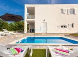 Otok Krk, Dobrinj okolica, moderna dvojna kuća na dvije etaže s bazenom i okućnicom. Ukupna stambena površine iznosi 82 m2, a sastoji se od kuhinje s blagovaonicom, wc, dvije spavaće sobe i kupaonice s balkonom. U okviru posjeda je uređena okućnica s bazenom i sunčalištem, roštiljem,....