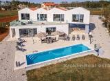 Luksuzna villa najvišeg standarda po kvaliteti i dizajnu, izgrađena 2020 godine! Prizemlje se sastoji od suvremeno opremljene kuhinje, prostranog dnevnog boravka s blagovaonicom i trpezarijskim stolom za 14 osoba, jedne spavaće sobe s kupaonicom, te WC-om. Na prvom katu se nalaze....