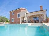 Prekrasna kuća s velikim bazenom od 35 m2. Kvadratura kuće je 168 m2, okućnica je 750 m2. Ima 2 parking mjesta. Kuća se sastoji od dnevnog boravka, kuhinje s blagovaonom, 4 spavaće sobe,3 kupaone. Ima kamin. Grijanje je na klimu i na peć. Udaljenost od mora 4,5 km, od Poreča i Novigrada....