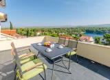 Seget, Seget Donji Prekrasna kuća sa 3 moderno dizajnirana stana u Segetu Donjem s pogledom na more Površina kuće: 427m2 Površina zemljišta: 547m2 Objekt se sastoji od: SUTEREN 2 garaže i sprema PRIZEMLJE stan koji se sastoji od kuhinje, blagovaonice, dnevnog boravka, 2 spavaće sobe,....
